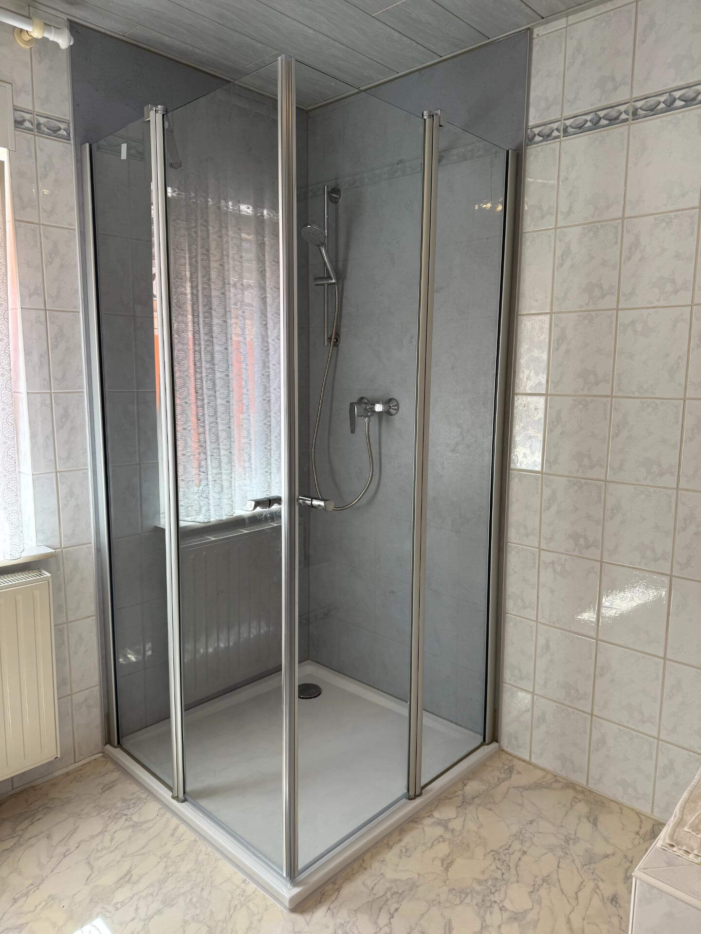 Im Mittelpunkt steht die extraflache Duschwanne (100 × 100 cm) mit Antislip Invisible Grip. Sie bietet sicheren Halt, ohne auf ein modernes Design zu verzichten. Durch den pendelbaren Eckeinstieg wird die Dusche flexibel und platzsparend nutzbar – ideal für den Alltag.