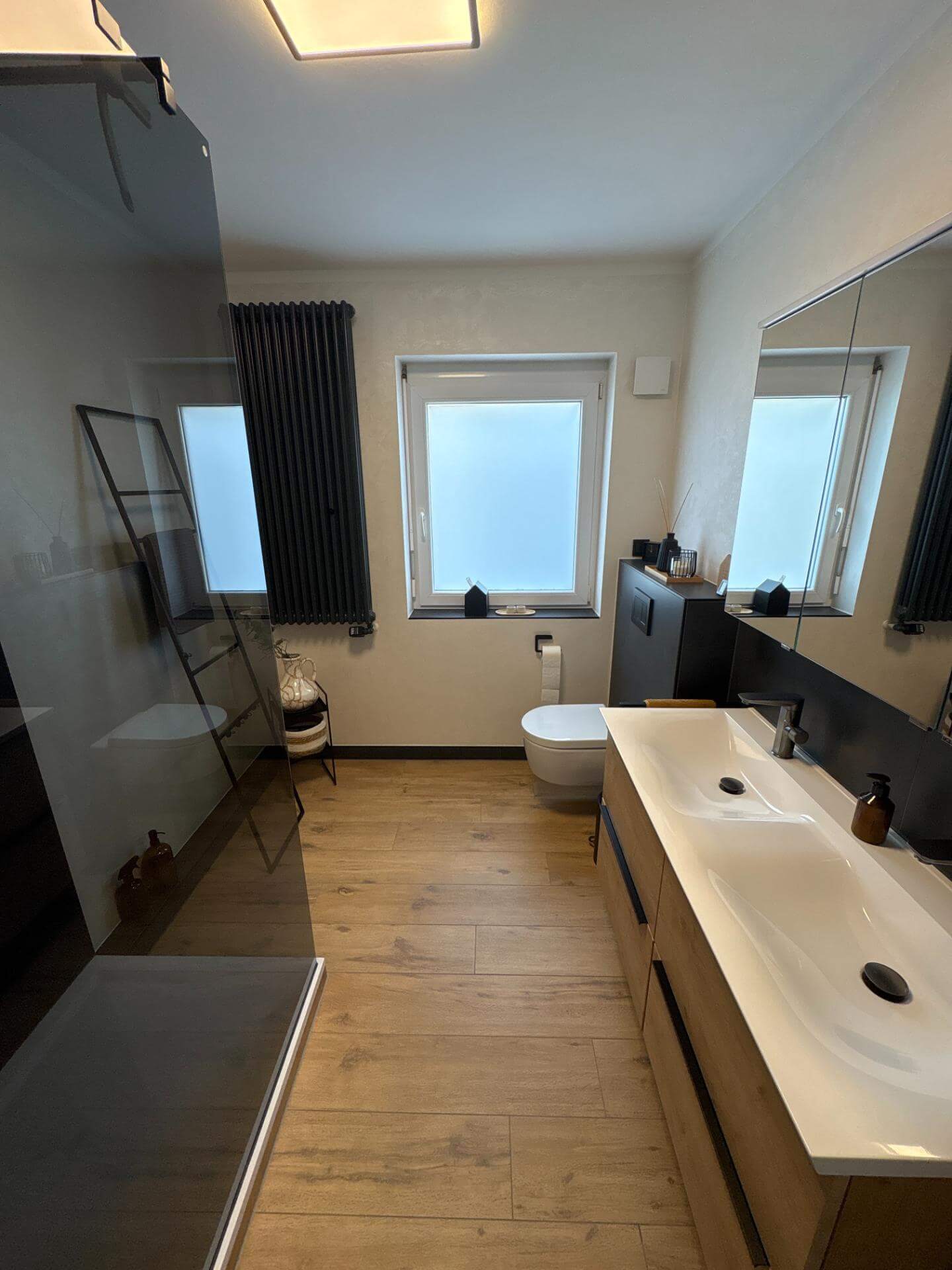 Der neue Waschtisch mit Doppelwaschbecken und passendem Spiegelschrank sorgt für viel Stauraum und Komfort im Alltag. Ergänzt wird das Konzept durch passende Badmöbel in Holzoptik sowie einen modernen, schwarzen Designheizkörper. Stilvolle Accessoires und klare Linien vollenden den zeitlosen Look.