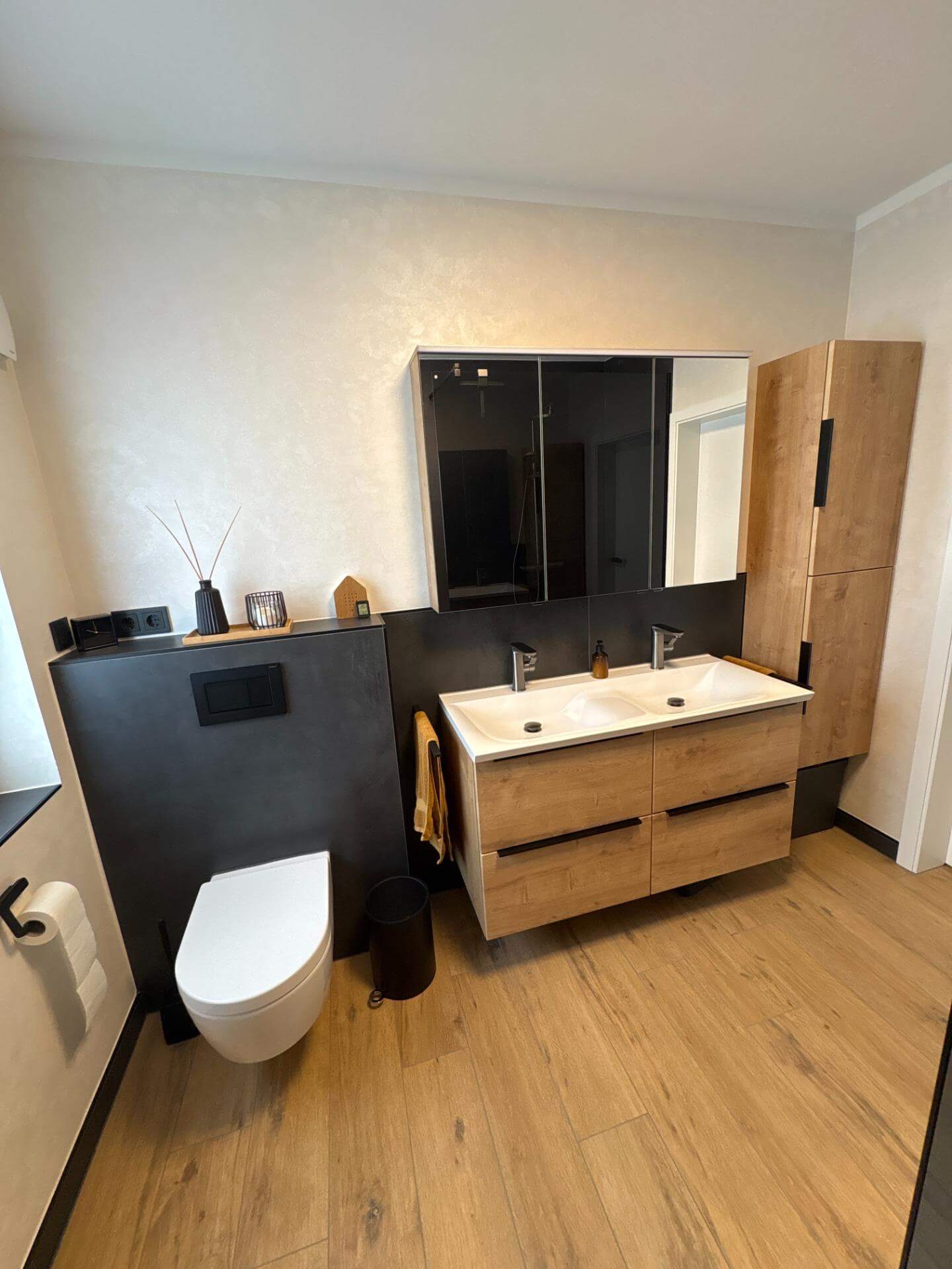 Bei diesem Projekt im Landkreis St. Wendel haben wir ein komplettes Badezimmer neu gestaltet und dabei eine harmonische Kombination aus natürlicher Holzoptik und dunklen Akzenten geschaffen. Das Ergebnis ist ein modernes Wohlfühlbad, das Funktionalität, Komfort und Design perfekt verbindet.