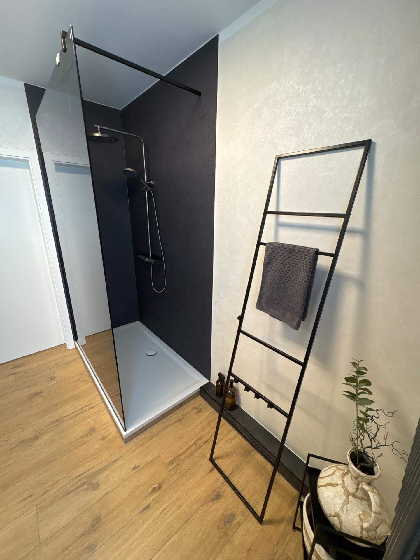 Die bodengleiche Dusche wurde mit einer schwarzen Glasabtrennung und einer großformatigen fugenlosen Wandgestaltung umgesetzt. Dadurch wirkt der Raum großzügiger und ist zugleich besonders pflegeleicht. Die dunkle Akzentwand bildet einen eleganten Kontrast zur warmen Holzoptik des Bodens.